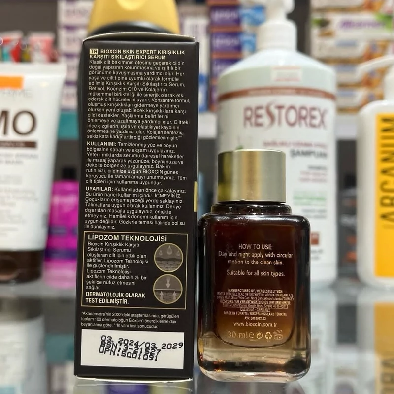 سرم صورت بیوکسین Bioxcin حاوی رتینول 1 درصد اورجینال ترکیه ضدچروک و لک و جوانساز مناسب انواع پوست حجم 30 میل