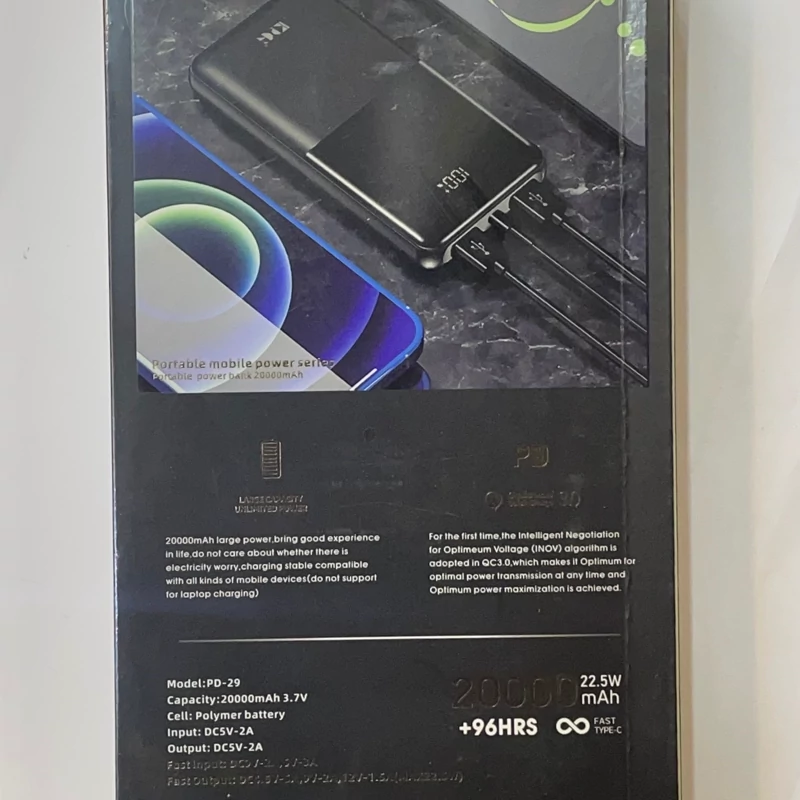 این پاوربانک دارای ظرفیت 20000 میلیآمپر ساعت است که میتواند به راحتی چندین بار گوشیهای هوشمند و تبلتهای شما را شارژ کند. PD29 مجهز به دو پورت خروجی USB و یک پورت خروجی Type-C است که از فناوریهای شارژ سریع PD 22.5W و QC 3.0 پشتیبانی میکنند. این فناوریها به شما امکان میدهند دستگاههای خود را با سرعت بالایی شارژ کنید.