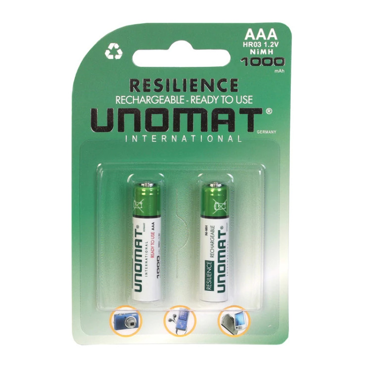 باتری «NI-MH-HR03» محصولی از برند «یونومات» (UNOMAT) است. در این محصول، 2 عدد باتری نیمقلمی از نوع قابل شارژ قرار دارد که آماده به استفاده و داری شارژ میباشند و میتوان آنها را پس از تخلیه بهوسیلهی شارژر مجددا شارژ کرد. خود شرکت سازنده، شارژرهای خاصی را برای این کار تولید کرده است؛ البته میتوان از شارژرهای سایر برندها هم برای این کار استفاده کرد. نوع فناوری بهکاررفته در این باتریها «نیکل – متال هیدرید» (Ni – MH) است و ظرفیت نامی هریک از آنها 1000 میلیآمپر ساعت اعلام شده است. باتریهای نیکل–متال هیدرید در مقایسه با باتری آلکالاین، سه برابر قدرت بیشتری دارند و در دستگاههای High Drain عملکرد بهتری از خود نشان میدهند. خود شرکت سازنده این باتریها را به صورت ازپیششارژشده میفروشد و میتوانید بلافاصله پس از بازکردن بستهبندی، از باتریها استفاده کنید.. باتری NI-MH-HR03 برای استفاده در دستگاههایی مانند دوربین عکاسی، چراغ قوه و وسایلی از این قبیل که به قدرت زیادی نیاز دارند، طراحی شده است. استفاده از باتریهای قابل شارژ برای اسباببازیهای کودک که مرتبا باتری مصرف میکنند، بسیار مناسب است.
