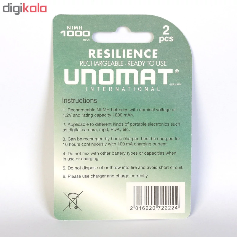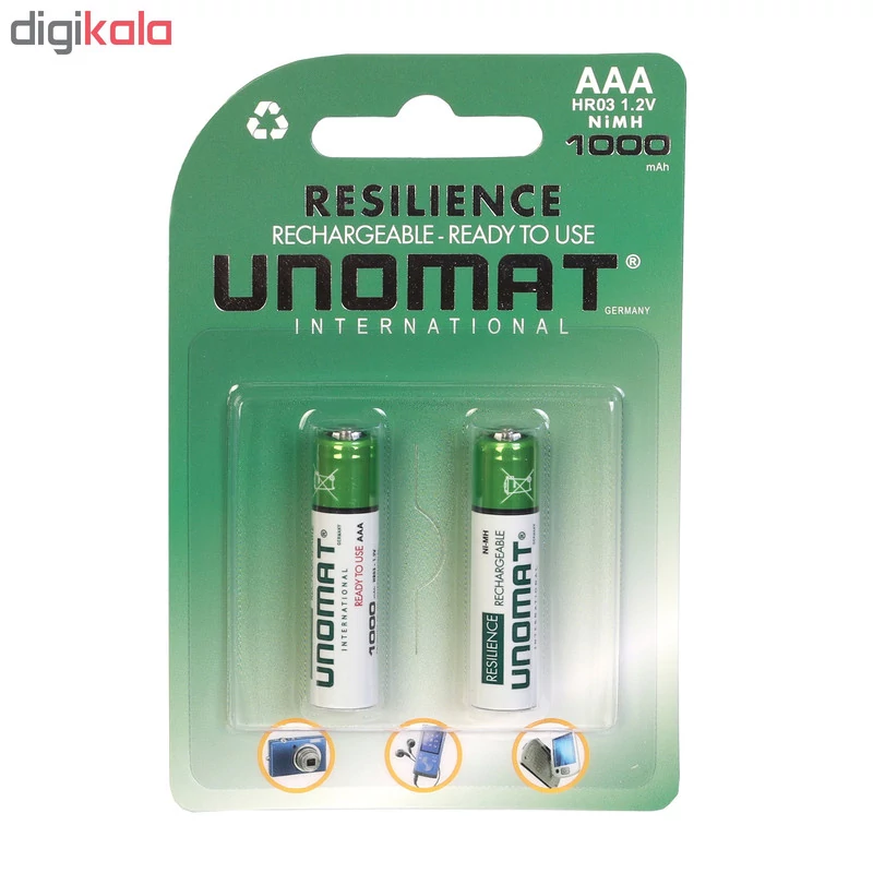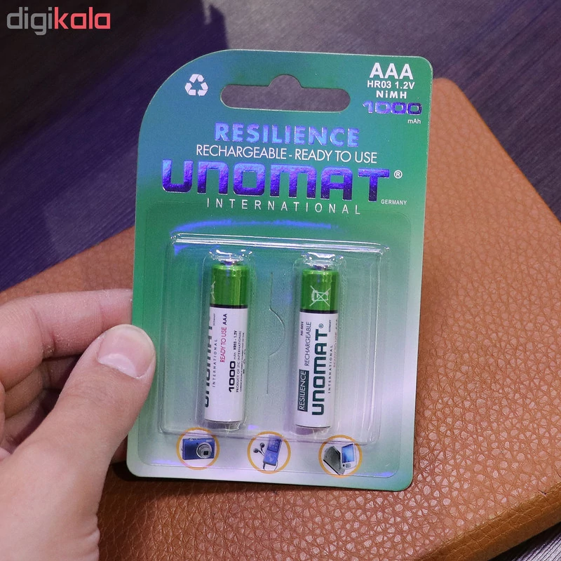 باتری «NI-MH-HR03» محصولی از برند «یونومات» (UNOMAT) است. در این محصول، 2 عدد باتری نیمقلمی از نوع قابل شارژ قرار دارد که آماده به استفاده و داری شارژ میباشند و میتوان آنها را پس از تخلیه بهوسیلهی شارژر مجددا شارژ کرد. خود شرکت سازنده، شارژرهای خاصی را برای این کار تولید کرده است؛ البته میتوان از شارژرهای سایر برندها هم برای این کار استفاده کرد. نوع فناوری بهکاررفته در این باتریها «نیکل – متال هیدرید» (Ni – MH) است و ظرفیت نامی هریک از آنها 1000 میلیآمپر ساعت اعلام شده است. باتریهای نیکل–متال هیدرید در مقایسه با باتری آلکالاین، سه برابر قدرت بیشتری دارند و در دستگاههای High Drain عملکرد بهتری از خود نشان میدهند. خود شرکت سازنده این باتریها را به صورت ازپیششارژشده میفروشد و میتوانید بلافاصله پس از بازکردن بستهبندی، از باتریها استفاده کنید.. باتری NI-MH-HR03 برای استفاده در دستگاههایی مانند دوربین عکاسی، چراغ قوه و وسایلی از این قبیل که به قدرت زیادی نیاز دارند، طراحی شده است. استفاده از باتریهای قابل شارژ برای اسباببازیهای کودک که مرتبا باتری مصرف میکنند، بسیار مناسب است.