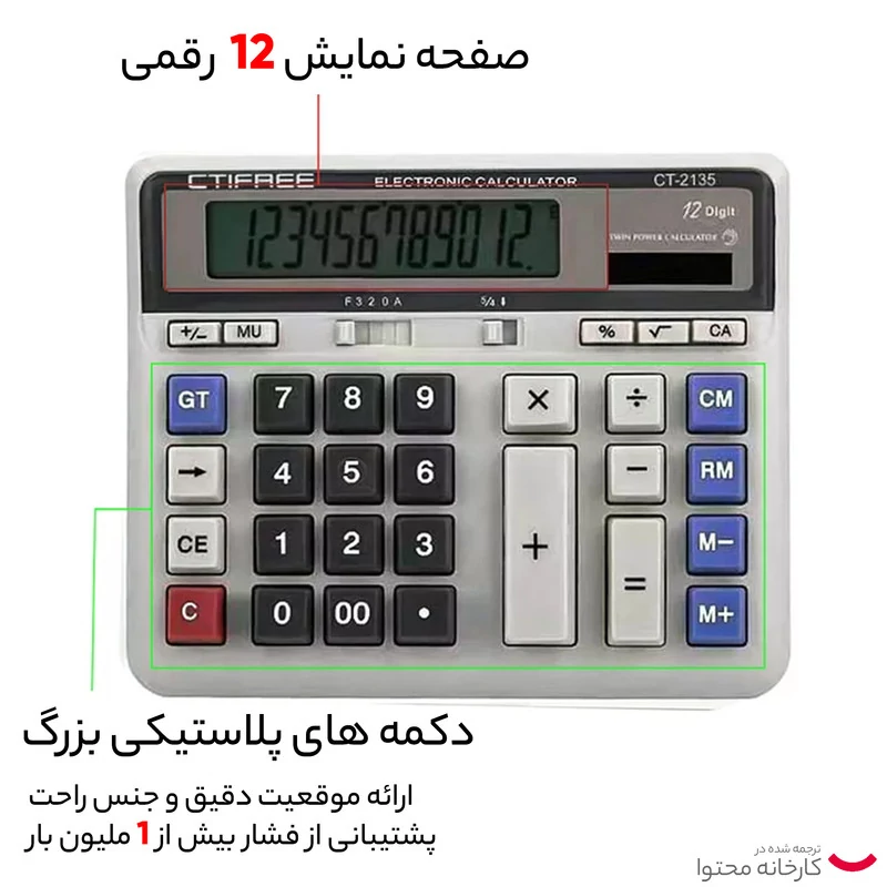 محصولی که در این قسمت مشاهده میکنید یکی از ماشینحسابهای رومیزی این شرکت است که قادر است در صفحهنمایش خود تا 12 رقم را نمایش دهد. این ماشینحساب که امکانات محاسباتی ابتدایی دارد برای انجام عملیات ریاضی پایه طراحی شده است و ازاینرو برای استفاده در محیطهای فروشگاهی مناسب است. از این ماشینحساب رومیزی انتظار نداشته باشید که عملیات پیچیدهی ریاضی را برای شام انجام دهد. با توجه به رومیزی بودن محصول، صفحهنمایشی که برای آن تعبیه شده است از ابعاد بزرگی برخوردار بوده و بهآسانی قابلخواندن است. برق مصرفی در این ماشینحساب از دو منبع باتری و پنل خورشیدی تأمین میشود. با این حساب میتوان گفت که برای مدتهای طولانی نیازی به تعویض باتری نخواهید داشت زیرا دستگاه برق مصرفی خود را با جذب نهور خورشید تأمین خواهد کرد و تنها در مواقع اضطراری مانند مواقعی که نور محیط کافی نباشد به باتری نیازی خواهید داشت.