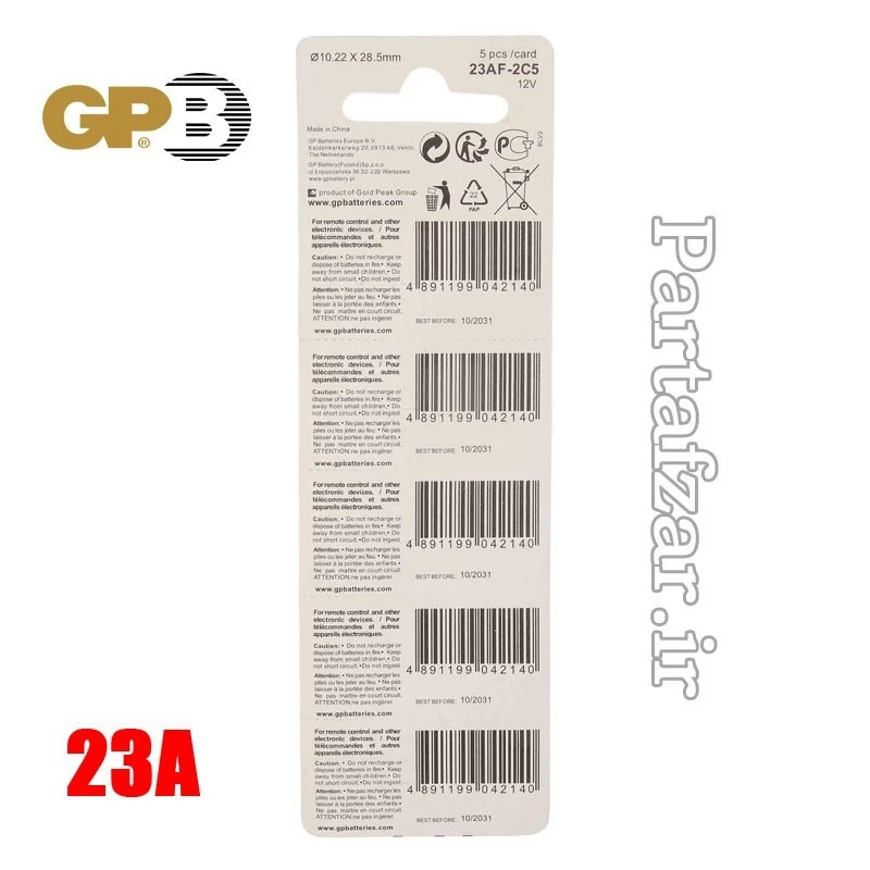 باتریهای 23A با برندهای مختلف: در بازار ایران، برندهای متنوعی از باتری 23A موجود است، از جمله GP، Varta، Duracell، Energizer، Panasonic، Tianqiu، Gigacell، Verity، Camelion، Orion و ... انتخاب برند مناسب به نیاز و بودجه شما بستگی دارد.