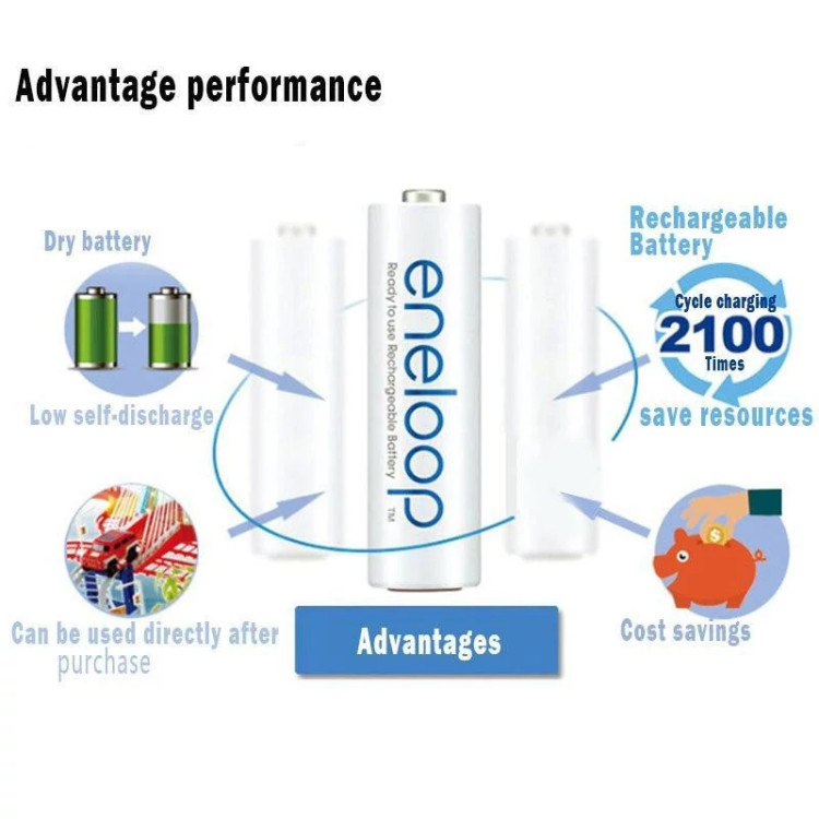 باتری های پاناسونیک eneloop/NI-MH از فناوری پیشرفته سلول های قابل شارژ پاناسونیک استفاده می کند که به آنها اجازه می دهد تا 2100 بار شارژ شوند. این سلول های باتری برای همه محصولات خانگی از جمله چراغ قوه ، دستگاه های بازی بی سیم ، دستگاه های فلش دوربین دیجیتال و موس و صفحه کلیدهای بی سیم کاربرد دارند.