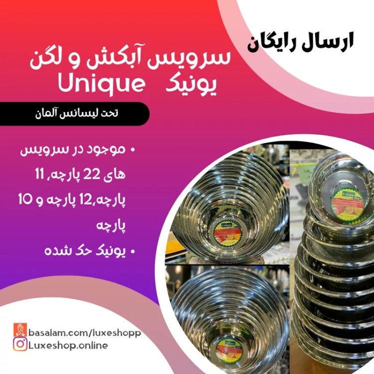 سرویس ۱۰ پارچه شامل ۵ عدد آبکش ۵ عدد لگن می باشد شروع سایز ها از ۲۲ و به ترتیب ۲۶،۳۰،۳۴،۳۸ می باشد حک شده مارک یونیک