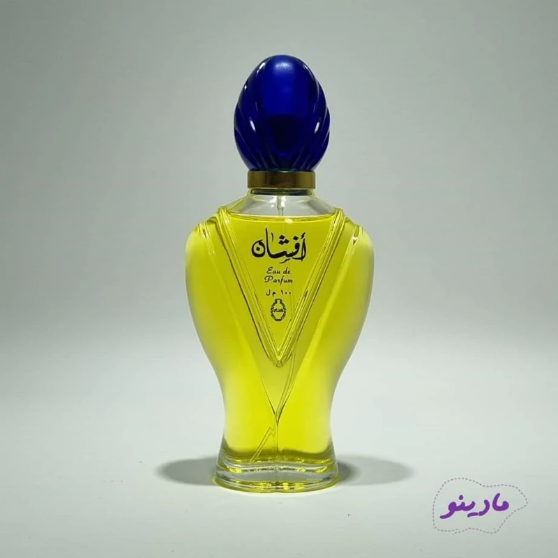 عطر ادکلن افشان با طراحی شیشهای خاص و طلایی رنگ با درپوش آبی سلطنتی و نوشتههای عربی، ظاهری لوکس و شرقی دارد.