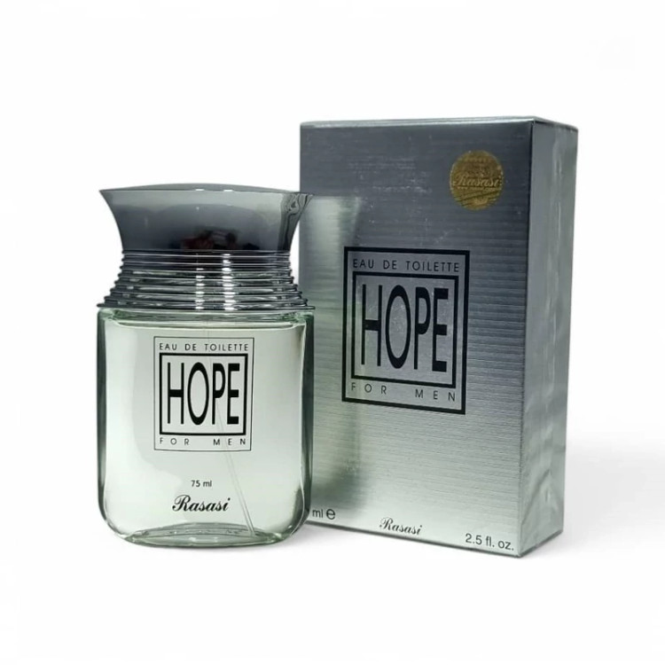 عطر ادکلن هوپ مردانه Rasasi Hope با طراحی شیشهای ساده و در عین حال مدرن با درپوش نقرهای و نام عطر به صورت برجسته، ظاهری شیک و مردانه دارد.