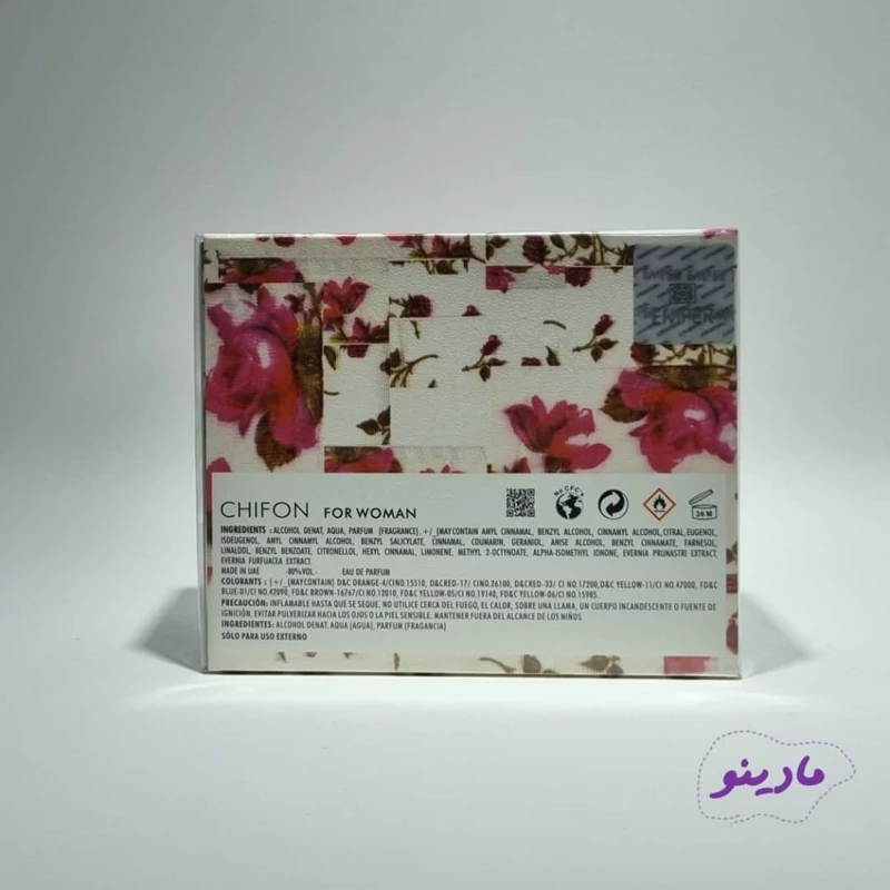 طراحی شیشه ادکلن Chifon با رنگ صورتی ملایم، پاپیون پارچهای رنگارنگ و درپوش صورتی، ظاهری بسیار زنانه و زیبا دارد.
