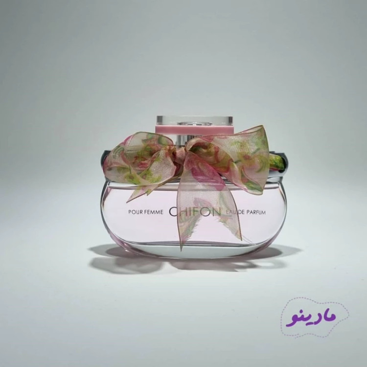 طراحی شیشه ادکلن Chifon با رنگ صورتی ملایم، پاپیون پارچهای رنگارنگ و درپوش صورتی، ظاهری بسیار زنانه و زیبا دارد.