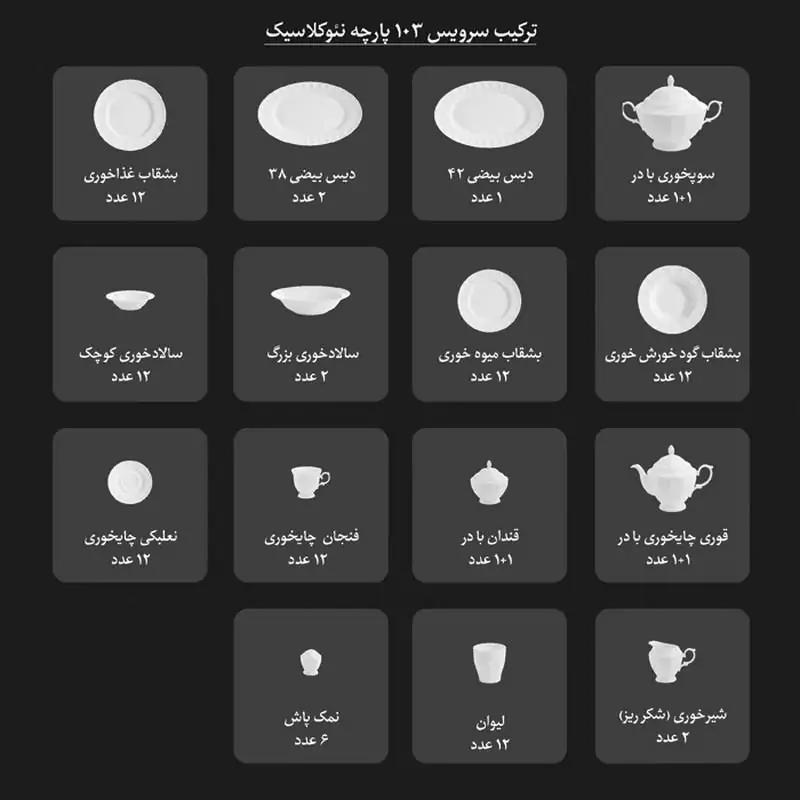 قالب نئوکلاسیک یکی از پرطرفدار ترین و جدید ترین قالب های چینی زرین است. قالب نئوکلاسیک هم مانند مابقی قالب ها شامل طرح های متنوع و درجه های یک و عالی است که بسته به هر درجه، میزان کیفیت و قیمت آن نیز تغییر میکند. یکی از نکات حائز اهمیت در چینی و خرید آن ، سبکی آن است. محصولات درجه یک و درجه عالی چینی زرین، دارای این سبکی مورد نظر است.