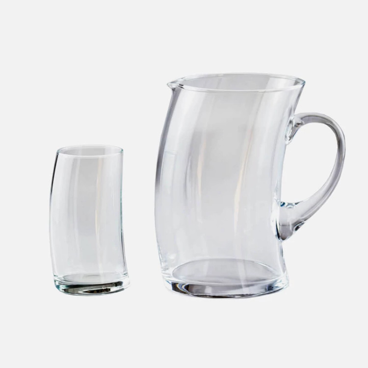پارچ و لیوان یکی از مهم ترین ملزومات برای پذیرایی می باشد ، همواره می دانیم که بلور و شیشه سالم ترین جنس برای نگهداری و مصرف نوشیدنی می باشد ، اگر چه در گذشته از ظروف سفالی و استیل استفاده میکنند ولی امروزه با پیشرفت تکنولوژی و وسعت صنعت بلور و شیشه ، عموم مردم از بلورجات برای مصرف استفاده میکنند. این پارچ و لیوان پنگوئن پاشاباغچه کد 93097 یکی از محصولات خاص پاشاباغچه است. شکل این ظروف به صورت کج و خمیده و یاد آور شکل پنگوئن ها است. کیفیت این محصول بسیار بالا بود و شیشه بسیار شفافی دارد.